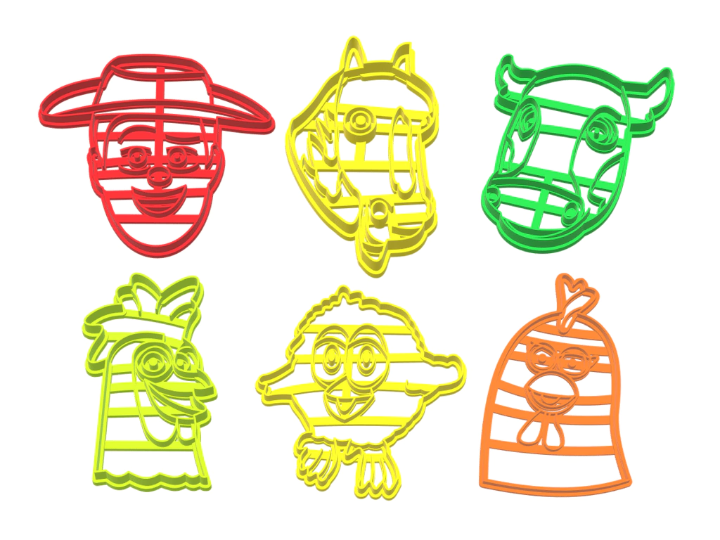 EL SET INCLUYE SEIS CORTANTES DE 7 CMS DE ALTO IMPRESOS EN 3D DE LOS SIGUIENTES PERSONAJES